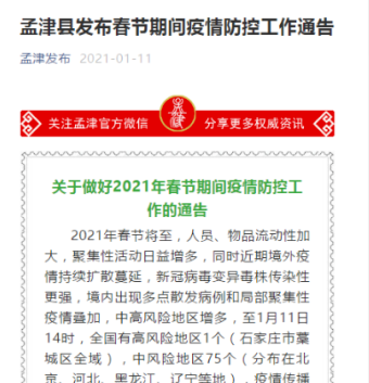 孟津縣關(guān)于做好2021年春節(jié)期間疫情防控工作的通告2021年春節(jié)將至,人員、物品流動性加大,聚集性活動日益增多,同時近期境外疫情持…